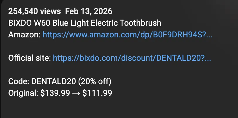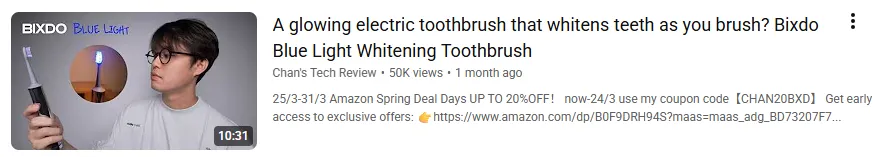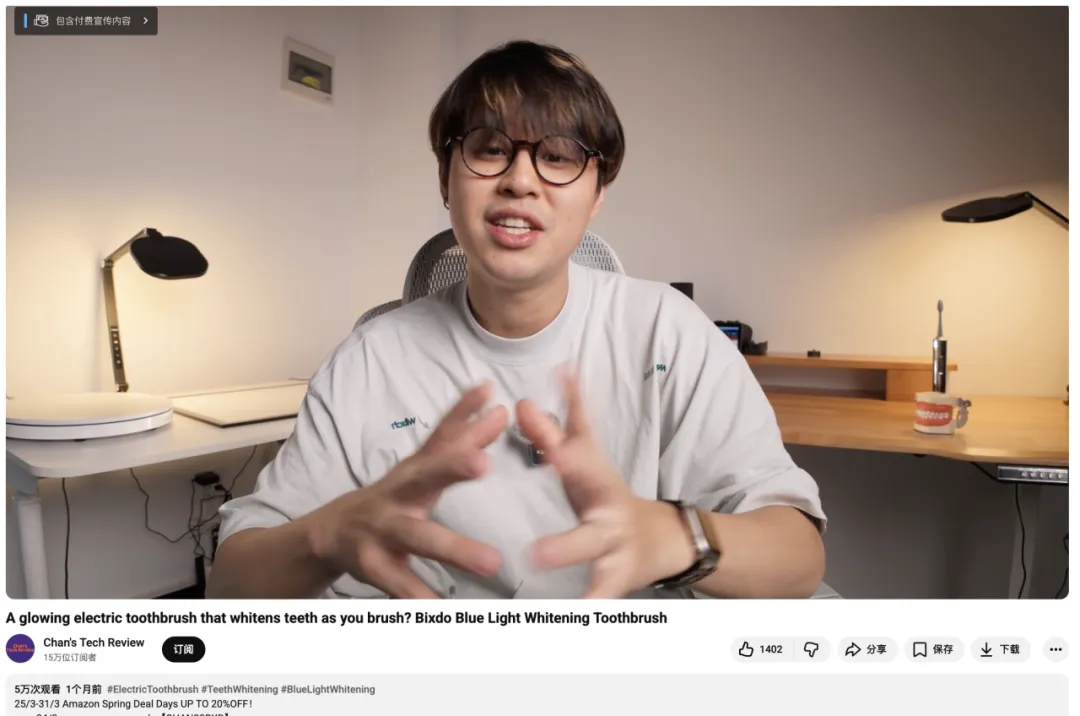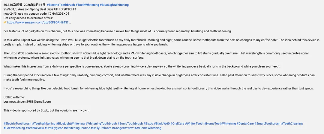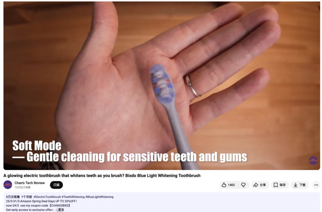 这种理性的叙事风格,配合他在视频描述区提供的专属 20% 折扣码与亚马逊直达链接,为 Bixdo 在海外建立起了一条从专业背书到销售转化的闭环路径。
