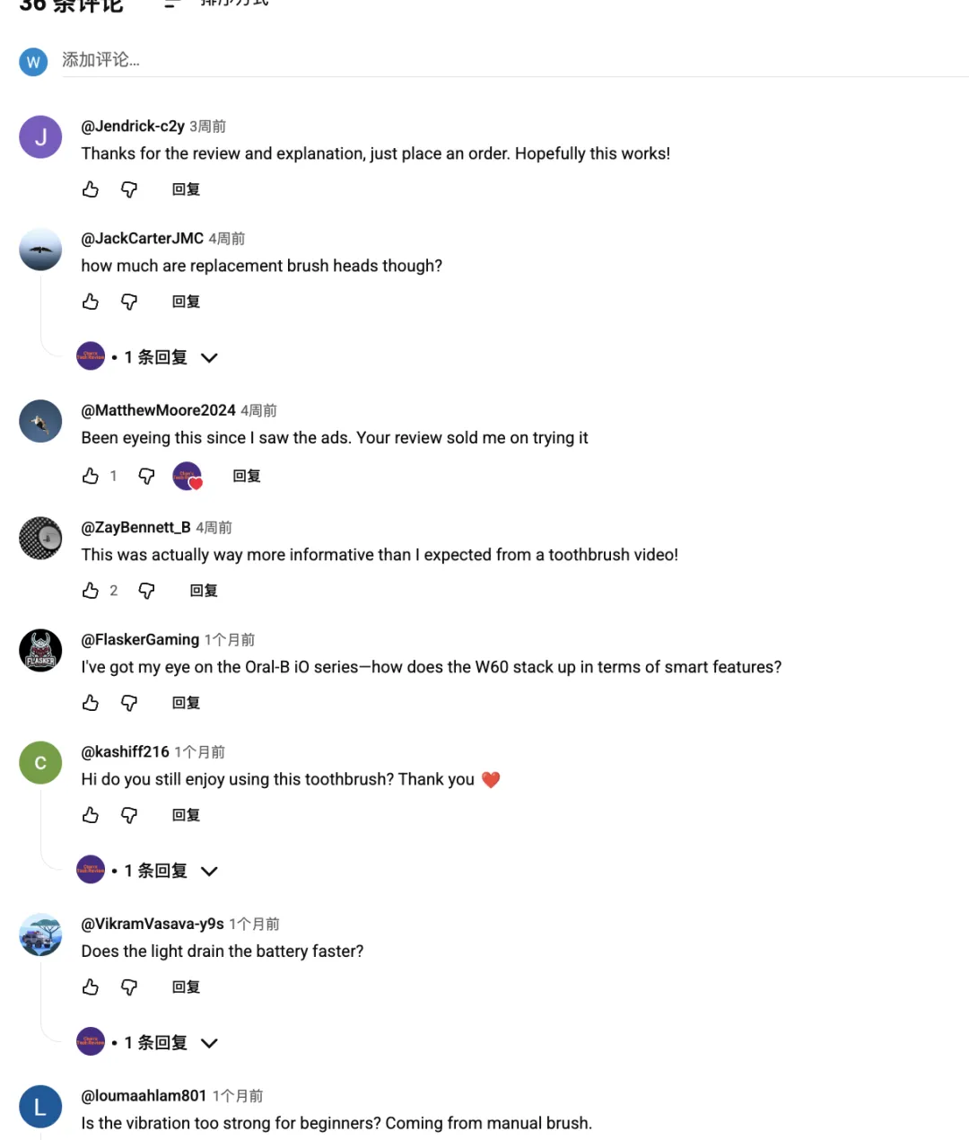 更具价值的是评论区的互动,Chan 针对用户关于耗材价格、与 Oral-B iO 系列竞品对比等尖锐提问进行了深度答疑,成功帮助 Bixdo 完成了品牌形象的科技化重塑。