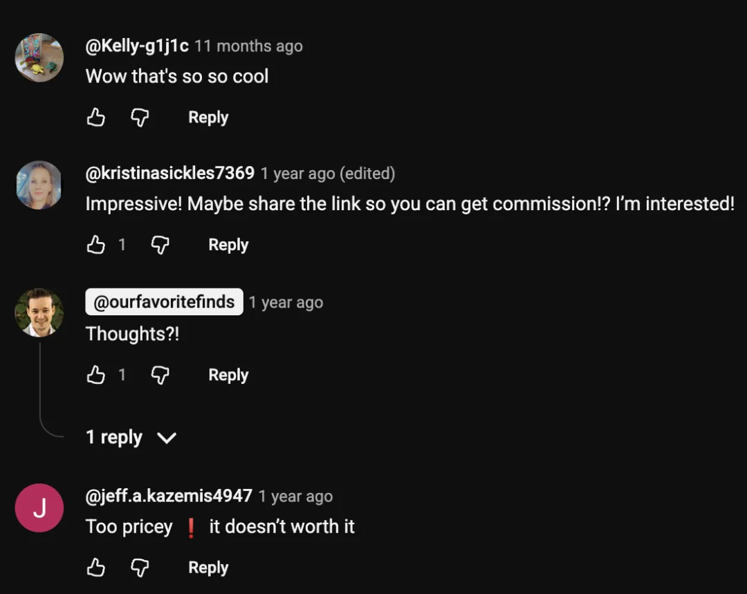 他不仅在视频中通过“买前必看”的逻辑引导用户决策,更在评论区和描述栏构筑了完整的闭环,同步提供 Amazon 直达链接与官网链接,覆盖不同购物习惯的受众。