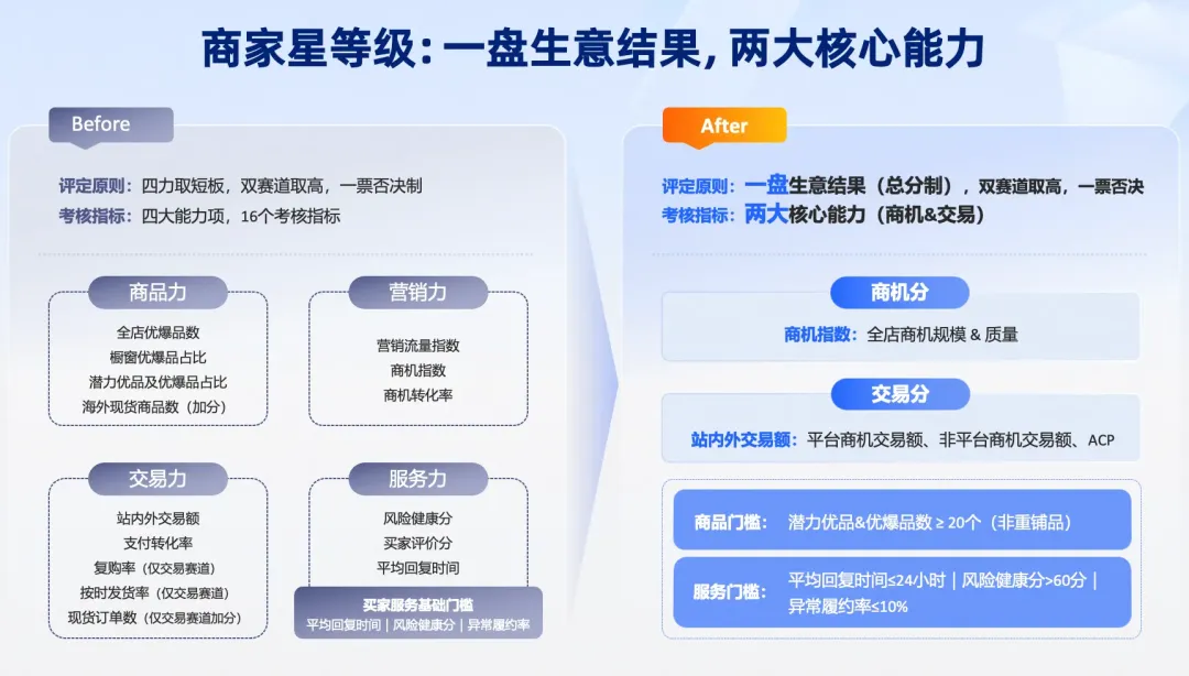 考核指标上:星等级由商机和交易两大核心能力共同影响,原16个考核指标简化为「商机指数」和「站内外交易额」,交易赛道额外考核「复购率」,各指标定义不变,各指标根据商家主营二级类目排名打分的规则也保持不变;保留一票否决制,新增商品门槛指标,服务门槛指标保持不变,其中任意一条门槛不达标均无法晋级为星级商家。