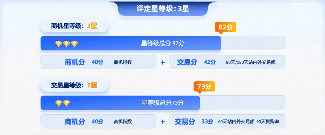 ○ 星等级更多是作为商家成长不同阶段的行业标杆和助推器,提供的是1+1>2的价值。商家可对标同行优秀商家不断提升自身能力,同时可享受星等级带来的流量扶持和高质量买家优先展示等权益,助力商家获得更多优质商机,高效成长。