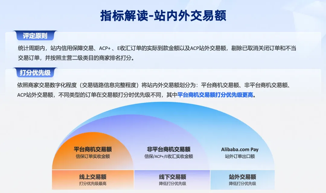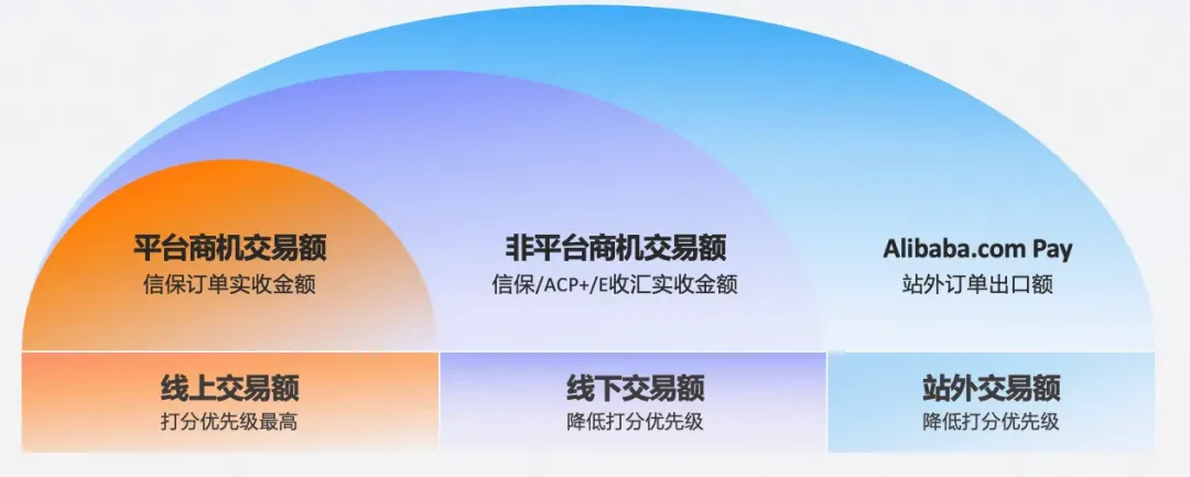 在站内外交易额的统计中,为了更真实地反映商家在平台承接商机和转化交易的能力,平台依照商家交易数字化程度(交易链路信息完整程度),将不同商机来源的订单区分打分优先级:平台商机交易额 > 非平台商机交易额 > ACP站外交易额,最终根据主营二级类目商家排名打分。平台商机带来的信保交易额越高,交易分越高。