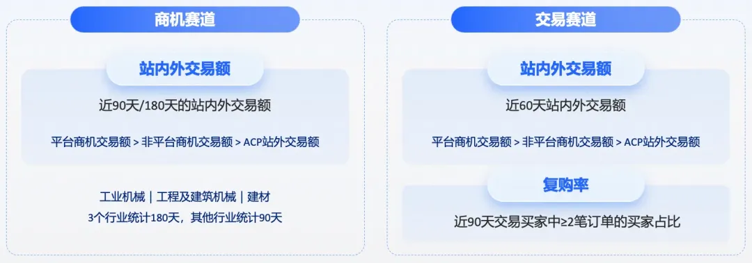 「站内外交易额」指标在商机赛道和交易赛道仅统计时间周期不同:商机赛道统计近90天,其中工业机械/工程及建筑机械/建材行业统计近180天,交易赛道统计近60天,其余考核规则、打分优先级双赛道保持一致;