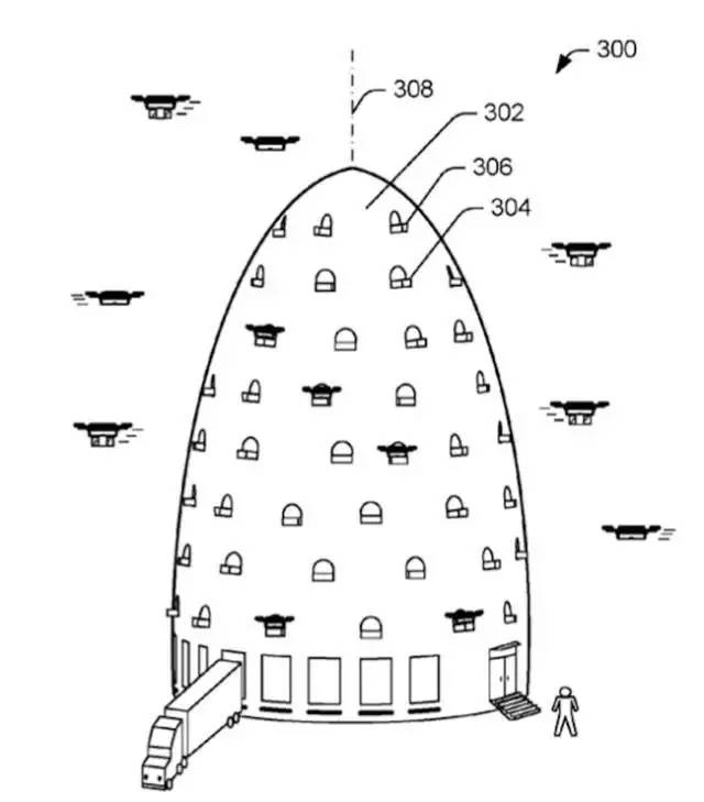 底层允许卡车和人进出,高层停满了无人机,塔内运用智能无人分拣系统。