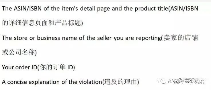 http://www.amazon.com/gp/help/reports/contact-us,选择页面左边“contact us“,然后让买家提供跟卖者所销售的产品与Listing描述不符合的地方,拍照为证。且要详细描述跟卖者所售产品与你正版产品的差异。并让客服留下邮箱,你追加一份邮件内容包括: