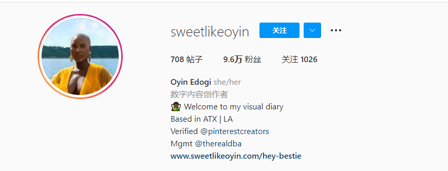Oyin Edogi,在ins上拥有9.6万粉丝。她鼓励粉丝自信地环游世界,并在过程中注重品质追求,关注自我。