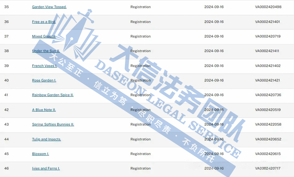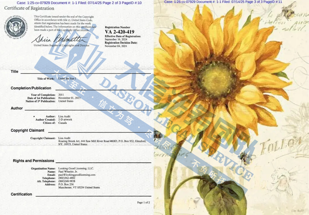 此案为版权维权,涉及1张向日葵版权图,版权号:VA 2-420-419,除此之外,原告在美国注册了46个版权,均与花卉动物有关!未经授权均不可擅自使用,侵权风险极高!以下是维权的具体信息,跨境卖家尽快检索下架,避免造成TRO侵权损失!