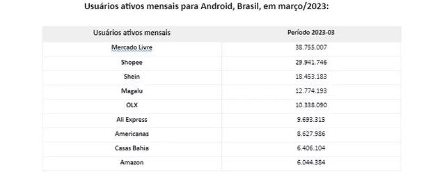 同样在3月,MercadoLivre拥有3870万活跃用户,位居第一;其次是Shopee,拥有2990万;Shein活跃用户为1840万,排在第三。