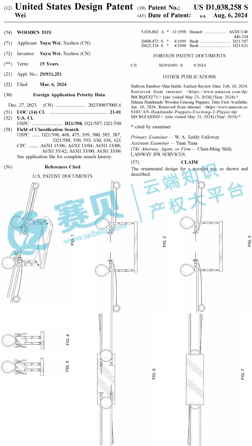 本案涉及一项美国外观设计专利USD1038258S,最早申请日期是2024年3月6日,下证日期是2024年8月6日,在此之后上架的相关外观产品或有侵权风险。
