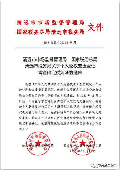 国家税务总局珠海市横琴新区税务局 珠海市横琴新区工商行政管理局 关于个人股权变更登记需查验完税凭证的通告 根据《中华人民共和国个人所得税法》规定,个人转让股权办理变更登记的,市场主体登记机关应当查验与该股权交易相关的个人所得税的完税凭证。 自2020年11月16日起,横琴新区登记的公司拟办理股权变更登记,涉及个人股权转让变更的,应先到横琴新区税务局完成相关个人所得税申报后,再向横琴新区工商局申请办理公司股权变更登记。办理涉及个人股权转让的公司变更登记业务时,横琴新区工商局将查验个人转让股权相关的个人所得税完税凭证,查验符合要求的,予以办理公司股权变更登记。对未依法完成相关纳税申报,查验不符合要求的,横琴新区工商局不予办理公司股权变更登记。 特此通告。 国家税务总局珠海市横琴新区税务局 珠海市横琴新区工商行政管理局 2020年11月12日 国家税务总局云浮市税务局 云浮市市场监督管理局 关于开展个人转让股权变更登记查验工作的公告 为加强我市个人转让股权的个人所得税征收管理,根据2018年8月31日修订的《中华人民共和国个人所得税法》以及国家税务总局《股权转让所得个人所得税管理办法(试行)》的有关规定,经国家税务总局云浮市税务局和云浮市市场监督管理局共同研究,决定自2021年1月1日起在全市范围内开展个人转让股权变更登记查验工作,现就有关事项公告如下: 一、个人股权转让应当自股权转让协议签订之日起30日内办理股权变更手续。发生个人股权转让业务的纳税人,应先到主管税务机关办理纳税申报,缴纳应纳税费,取得完税凭证后,再向市场监督管理部门申请办理股权变更的注册登记,市场监督管理部门应先查验完税凭证后方可受理业务申请,未能提供完税凭证的,市场监督管理部门将不予受理股权转让的业务申请。 二、办理股权转让纳税申报需要提供如下资料: (一)纳税申报表; (二)股权转让合同(协议); (三)股权转让双方身份证明; (四)按规定需要进行资产评估的,需提供具有法定资质中介机构出具的净资产或土地房产等资产价值评估报告; (五)计税依据明显偏低但有正当理由的证明材料; (六)主管税务机关要求报送的其他材料。 三、税务机关将对股权转让的涉税事项进行审核并对发现的问题依法进行处理,纳税人、扣缴义务人应当积极配合税务机关开展相关工作。 特此公告。 国家税务总局云浮市税务局云浮市市场监督管理局 2020年12月4日 国家税务总局湘潭市税务局 湘潭市市场监督管理局潭税发 [2021]1号 关于规范股权转让所得个人所得税管理工作的通知 国家税务总局湘潭市各县市区税务局,各县市区市场监督管理局: 根据《中华人民共和国个人所得税法》及其实施条例、《中华人民共和国税收征收管理法》及其实施细则、《股权转让所得个人所得税管理办法(试行) 》(国家税务总局公告(2014)67号)相关规定,国家税务总局湘潭市税务局与湘潭市场监督管理局对个人股权转让实施联合管理,现就有关问题通知如下: 一、被投资企业发生个人股权转让行为, 在向市场监督管理部门办理变更登记手续前,扣缴义务人、纳税人应当依法在被投资企业所在地主管税务机关办理纳税申报,报送个人所得税申报表等相关资料。 二、国家税务总局湘潭市税务局与湘潭市市场监督管理局实行个人股权转让信息交互机制。市场监督管理部门应当在查验与该股权交易相关的个人所得税完税凭证、确认个人股权转让行为已经进行纳税申报后,依照相关规定为被投资企业办理股权变更登记。 三、主管税务机关应加强对个人股权转让所得计税依据的评估和审核。对不能正确计算股权原值以及申报的计税依据明显偏低且无正当理由等情形的,主管税务机关可以核定股权原值和股权转让收入。 四、主管税务机关和市场监督管理部门应加强部门联系和协作,联合制定有效措施,积极推进股权转让各税种协同管理。 五、本通知自发布之日起施行。 国家税务总局湘潭市税务局 湘潭市市场监督管理局 2021年1月12日