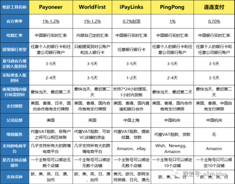 当然,对于支付环节,卖家关心的还有费率、时效、安全等因素。成本能少一点,利润就能高一点。谁也不想浪费任何一分真金白银,因此卖家对于费率还是相当看重的。目前,亚马逊官方收款测试费率为1.25%,在目前的市场上,优势并不大。根据以下各大跨境支付企业的费率和增值服务对比图可以看出。