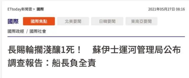 5月27日,苏伊士运河管理局调查认定:“长赐号”船长为搁浅事故负全责。