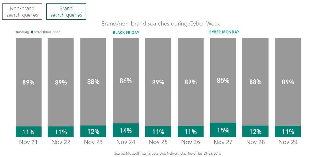 (上图为网一期间,必应上11月21日-11月29日期间品牌(绿色部分)和非品牌(灰色部分)的搜索量)