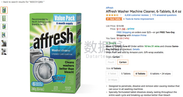 在上周Tools & Home Improvement品类的Best Seller榜单中,根据商品的登榜次数及平均排名进行综合排名,在位列 综合排名前五的商品中,骆探长(shujumai.com)发现, 来 自品牌Affresh的洗衣机清洁剂继续延续前两期以来的稳健发挥,在上周连续七天登顶榜单,以平均排名1.0的领先优势位列商品综合排名首位;
