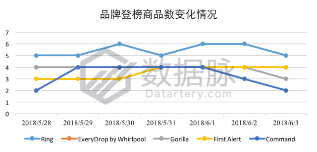 在上周Tools & Home Improvement品类的Best Seller榜单中,根据各个品牌下商品的登榜次数进行综合排名,在位列 综合排名前五的品牌中,骆探长(shujumai.com)发现, 视 频门铃品牌Ring延续上期的稳健发挥,连续七天每日至少登榜5款商品,凭借累积登榜38次的领先优势位列品牌综合排名首位;此冰箱水过滤器品牌 EveryDrop by Whirlpool也有着较为稳定的榜单表现,以累积登榜28次的优秀成绩位列品牌综合排名第二,紧随其后的来自胶水品牌Gorilla, 以累积登榜27次位列品 牌综合排名第三。