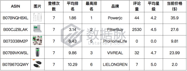 在上周Tools & Home Improvement品类的Hot New Releases榜单中,根据商品的登榜次数及平均排名进行综合排 名,在位列综合 排名前五的商品中,骆探长 (shujumai.com)发现来 自品牌Powerjc的电源转换器与来自品牌FilterBuy的空气过滤器在上周均连续七天进入榜单前五,两者表现均较为出色,分别以平均排名 1.86、3.14的领先优势位列商品综合排名第一、第二;