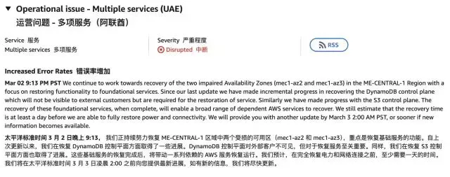 当地时间3月3日,亚马逊位于中东地区的三处云数据中心因无人机袭击受损,导致其阿联酋(ME-CENTRAL-1)和巴林(ME-SOUTH-1)区域的服务发生大规模中断。