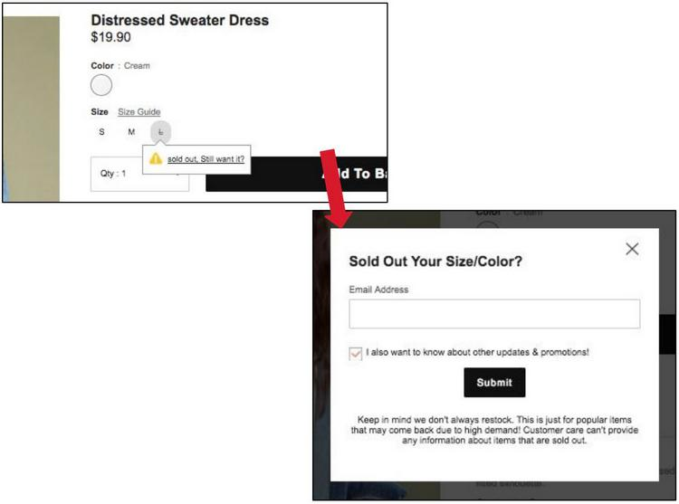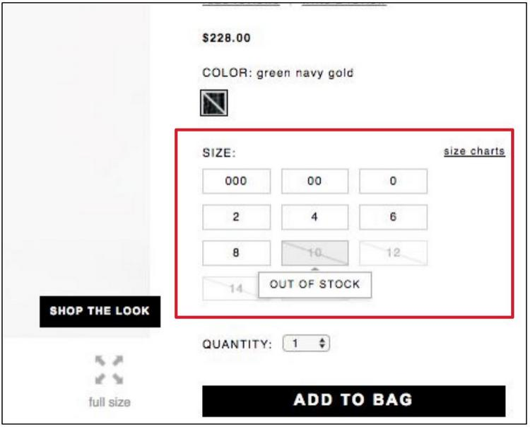 简单明了地显示商品不同尺寸规格的库存情况,这样消费者就能清楚知道适合自己的商品是可以选择购买的状态。