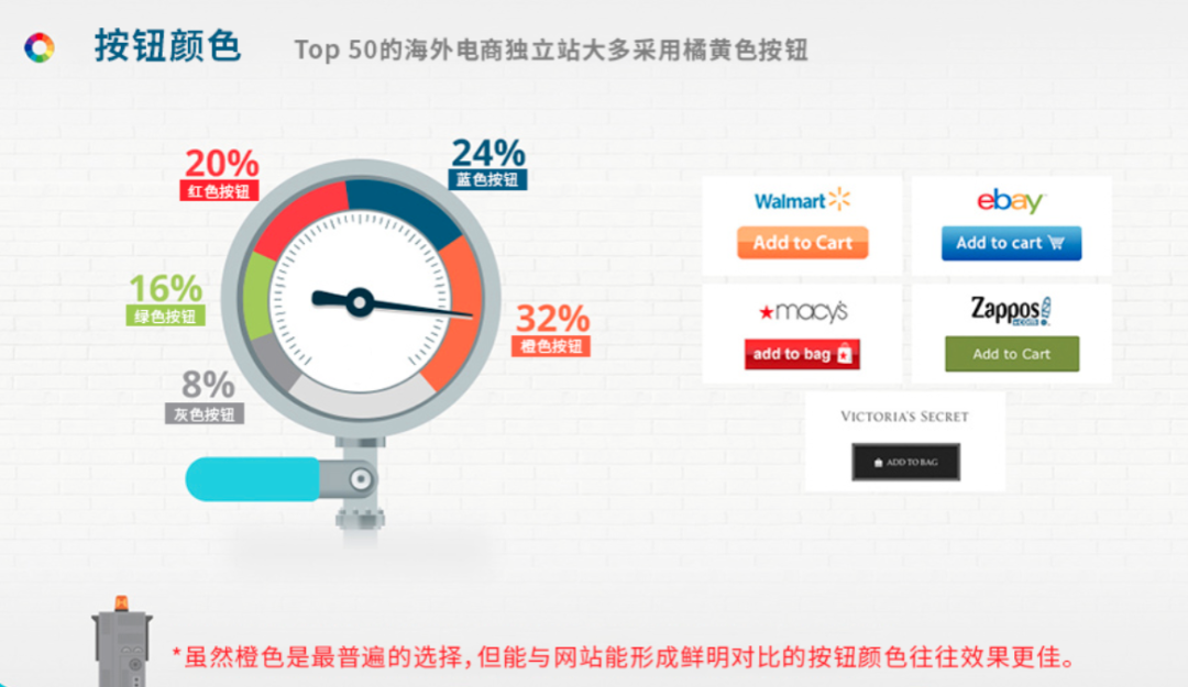 基于这个目标,32%的加购按钮为橙色。想知道更多关于加购按钮的问题,请戳海外Top 50独立站,加购按钮竟这样设计?