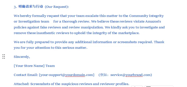 如果第一封邮件收到的是模板回复,千万别关掉那个Case。就在同一个邮件线程里礼貌回复,可以简单重申:“感谢回复,但我们再次强调,这些评价具有明显的虚假特征(集中爆发、内容空洞、账户可疑),恳请进一步调查。” 坚持和多沟通一次,往往就能推动问题升级。