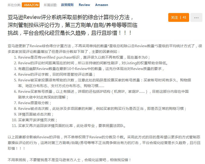 再发展到现在,亚马逊review新算法调整我个人感觉更多的是在评论质量内容考核方面下了功夫,这个其实也贴切亚马逊的社区运营的初衷,为消费者打造一个高质量的站内review,qa社区,引领未消费做出正确的消费抉择,为亚马逊市值突破宇宙天际而做出贡献(最后一句开个玩笑)。