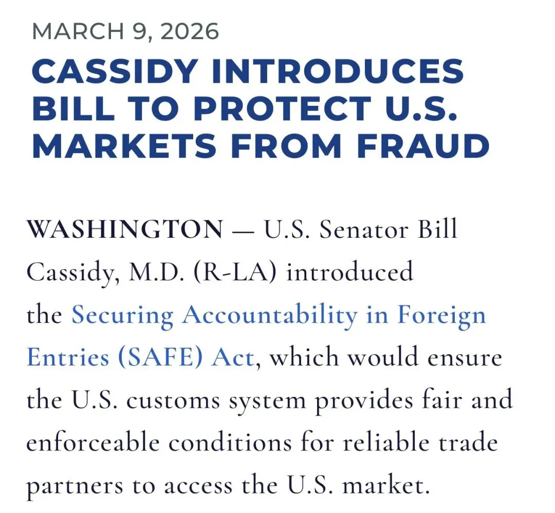 2026年3月9日,美国参议院的一纸法案,让无数跨境电商卖家彻夜难眠。《保障外国进口问责法案》(SAFE Act)的提出,标志着美国海关监管从“形式合规”向“实质准入”的致命一跃。