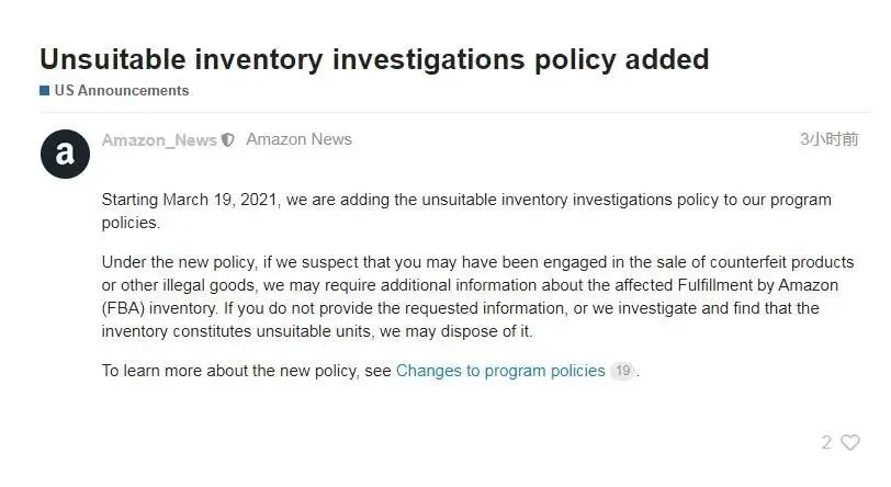 【亚马逊FBA出重磅新政!违规商品将被直接处理】近日,亚马逊美国站发布了一则有关新增“调查违规库存政策”的公告,公告内容如下: