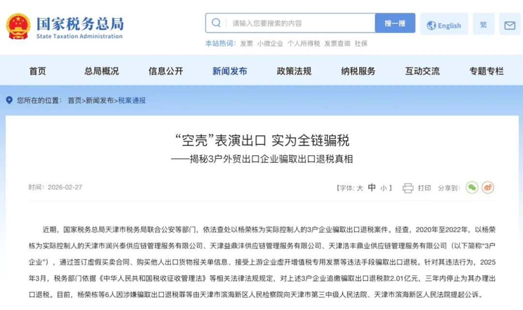 不久前,国家税务总局公布了一起震动行业的重磅案件:天津三家供应链公司,通过一套“精密”的骗税组合拳,两年间竟骗取了高达2.01亿元的出口退税!主犯已被提起公诉,企业不仅被追缴全部税款,还被停止办理出口退税三年。