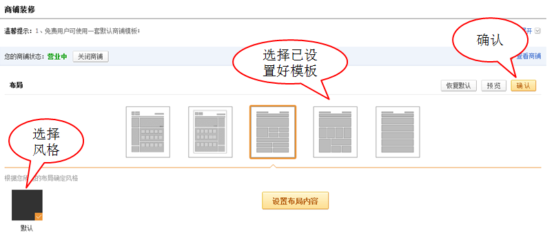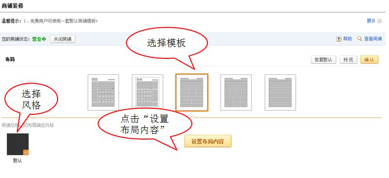 设置完成后,选择对应的模板、风格,点击“确认”。如果新人模板无法满足店铺需求,可以在后台购买相应的功能进行深层装修。