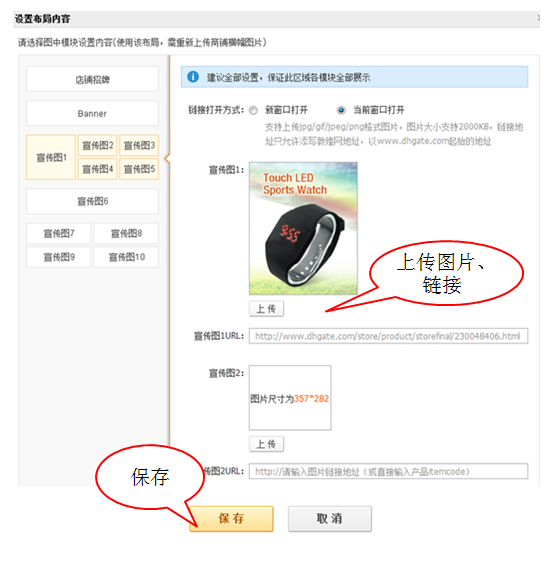 根据左侧店铺装修的提醒,注意设置店铺的各个展示位的信息,务必按照页面提示上传相应尺寸的图片,并且保证图片清晰、美观, 多图片区域建议全部上传图片,保证页面效果。
