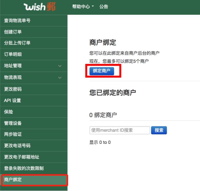 登录Wish邮账号,点击“商户绑定”(https://wishpost.wish.com/bind-merchant-page)。