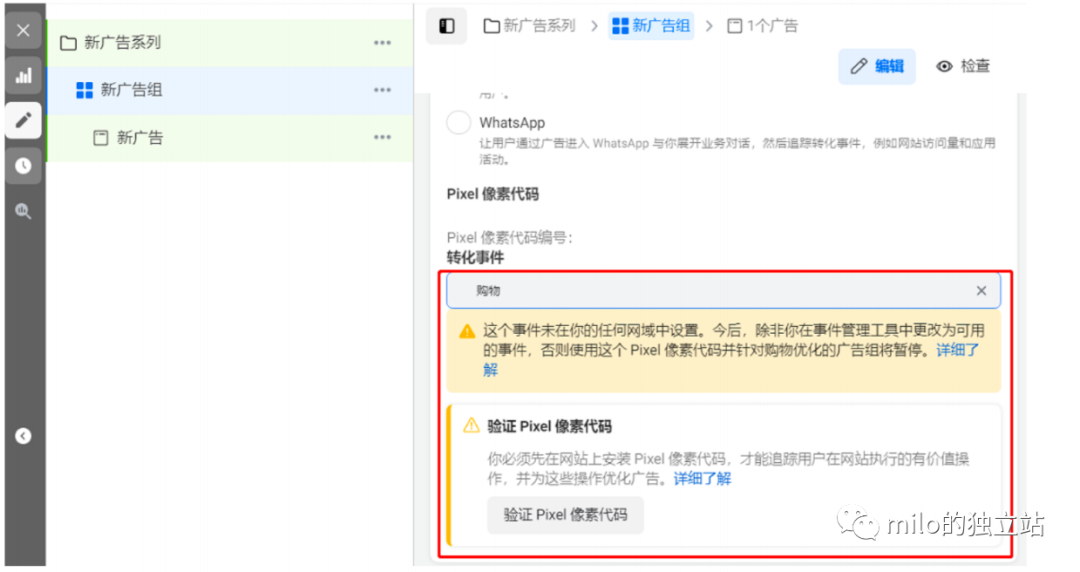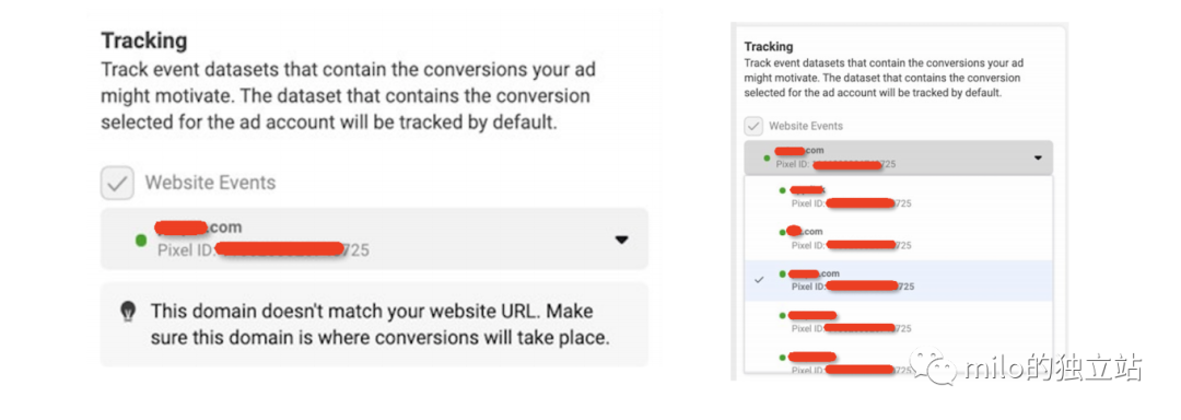 4 . 广告组可以选择想要的像素和事件,但是广告层级勾选pixel 地方出现提示网站链接和网域不符: