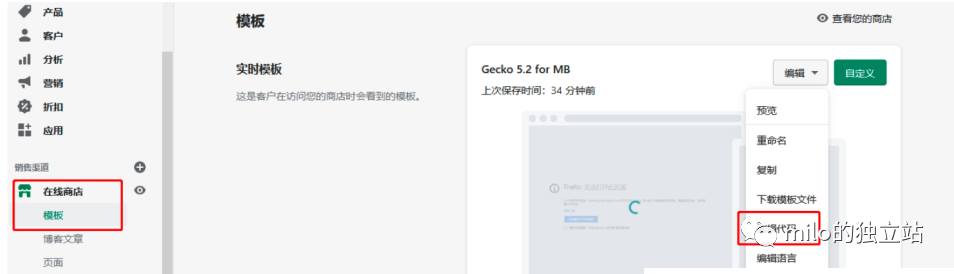 3 . Shopify 网站管理员进入【 在线商店】- 【模 板】- 【实时模板】 - 【 编 辑】 - 【 编 辑代 码】-【layout】-【 主 题】- 将代码段粘帖到网站首页<head>中 。