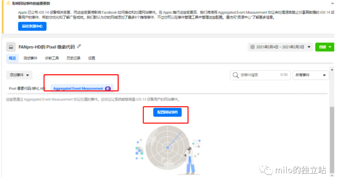 1 . 拥有像素权限的 BM 管理员进入【事件管理工具】- 【概 览】 - 【 Aggregated Event Measurement】 - 【 配置网站事件】