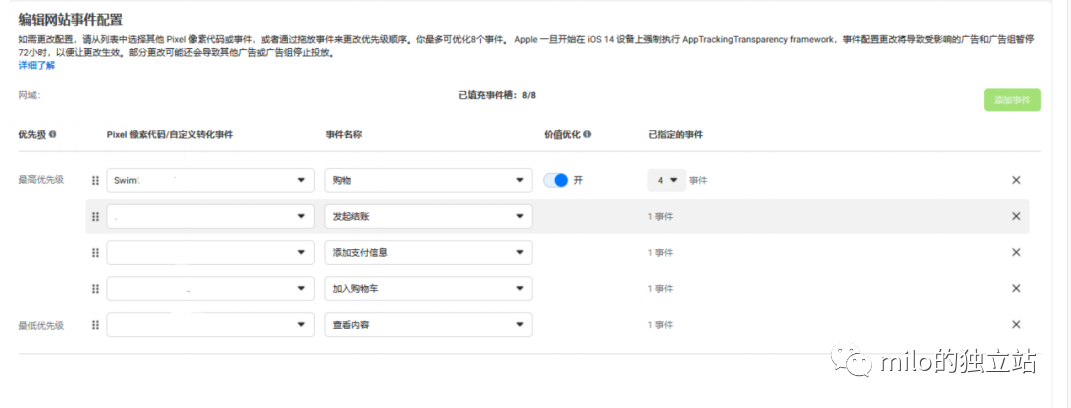 3. 选择Pixel和事件,最多添加8个优化事件,您可以按从最高优先级到最低优先级的顺序排列事件。建议将“购买”放在第一位!