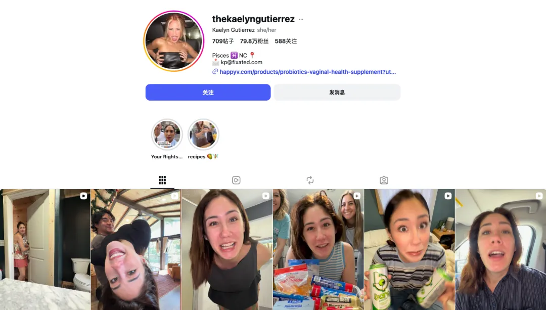 她是一个活跃在Instagram和TikTok的网红,内容很杂基本上就是记录自己的日常生活,但是风格非常活泼,很有活力,在视频中动不动就跳舞,但又没有刻意造作的浮夸感,因此吸引了不少女粉关注,其Ins账号有79.8万的粉丝关注,算是非常优质的腰部红人了。