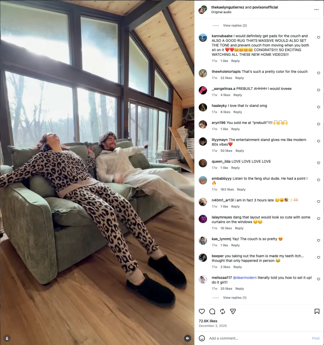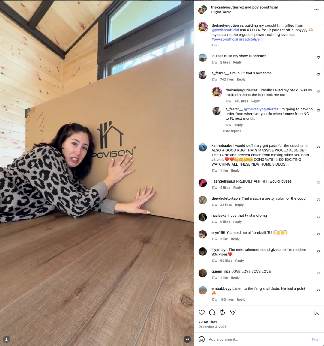 在具体的合作视频中,POVISON赞助了Kaelyn装修自己的阁楼,分别是电视柜和电动沙发,这两款都是品牌主推的拳头产品。
