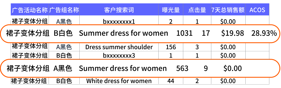 他发现关键词“Summer dress for women”为黑色组和白色组都带来了点击,不同的是这个关键词促进了白色组的销售,ACOS较低;却没有为黑色组带来任何销售。