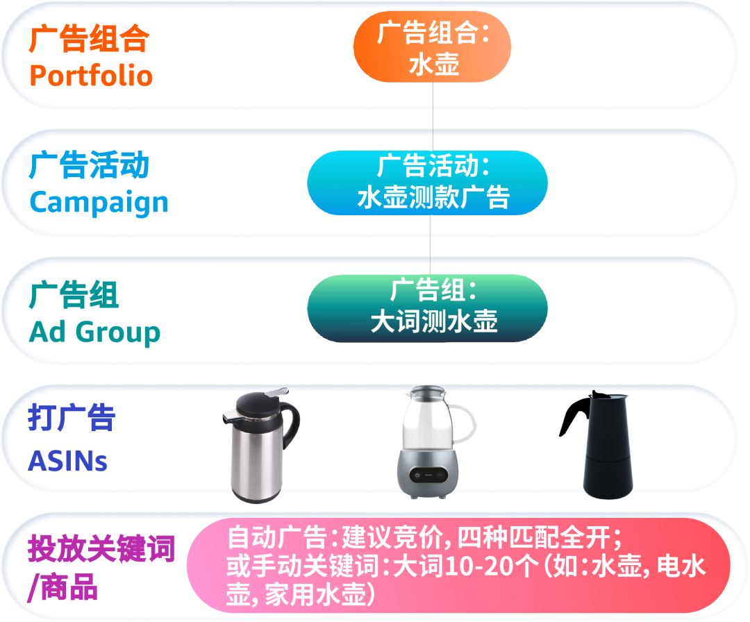 款式不多时可以使用建议竞价,为每个商品都开一个自动广告,例如为不锈钢水壶、玻璃水壶和设计师水壶各开一个广告,运行大概一周看看每个款式的效果,再选择曝光高、点击率高的商品进行重点推广。