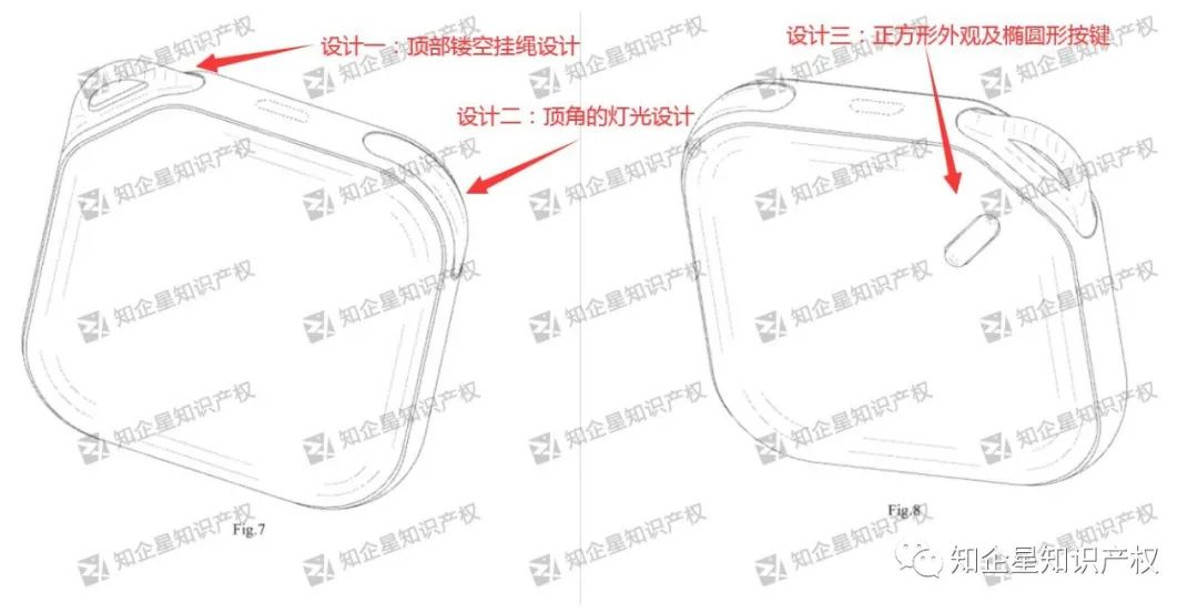 产品的核心设计点在于:1、正方形的整体造型;2、顶部的镂空挂绳孔设计;3、侧面顶角的手电筒设计。