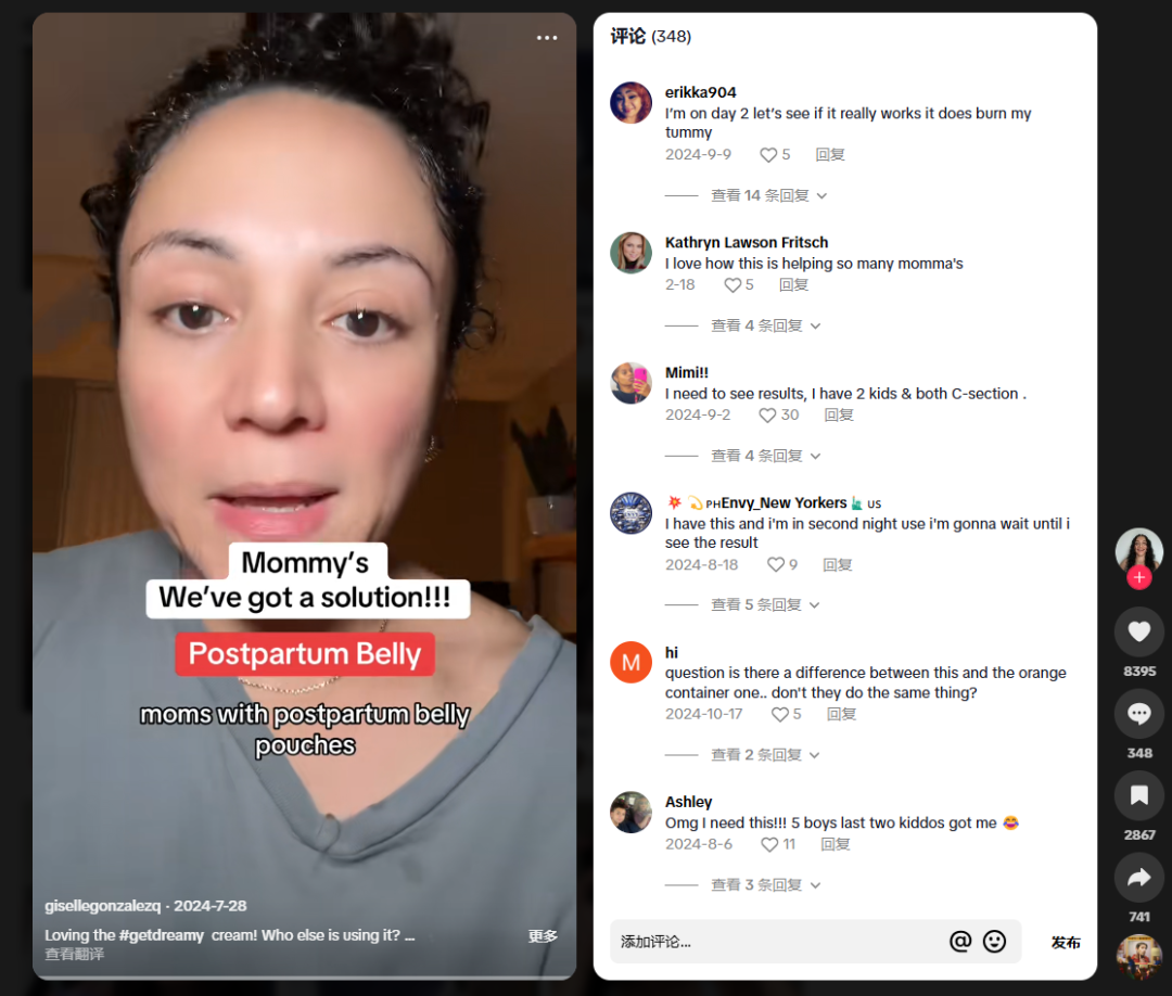 其介绍Maelys产品的视频获得了8395点赞,2867次收藏,741次转发,348条评论,视频中提及她的一位育有三个孩子的朋友用后觉得产品有效果,于是把产品推荐给了她。许多用户表达了对这款产品的需求。