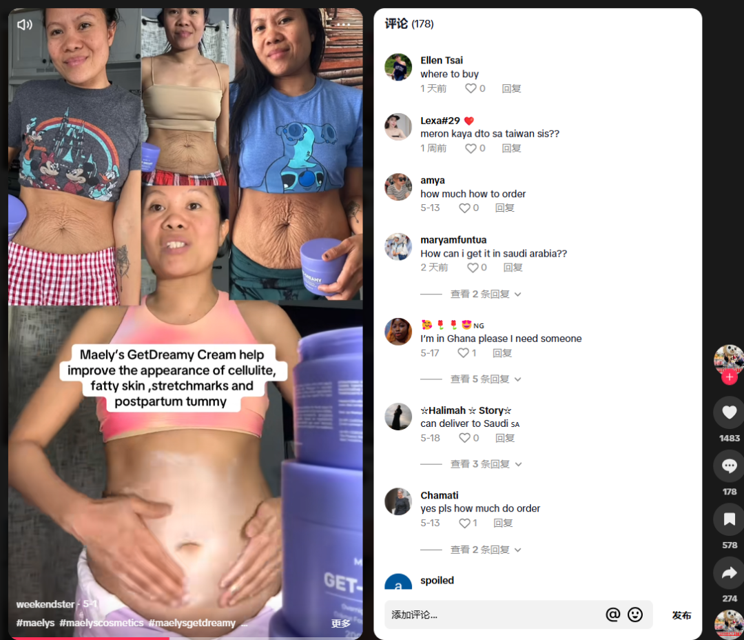 她在视频中将产品涂抹到腹部有妊娠纹的地方,并贴图展示了自己使用该产品后的效果图片。该视频获得了1483个点赞,578次收藏,274次转发和178条评论,许多用户表达需求,并询问购买方式和价格。通过平台算法的精准推荐和KOL博主短视频内容的直观展示、亲身使用和讲述,用户对产品的了解程度和信任会加深。