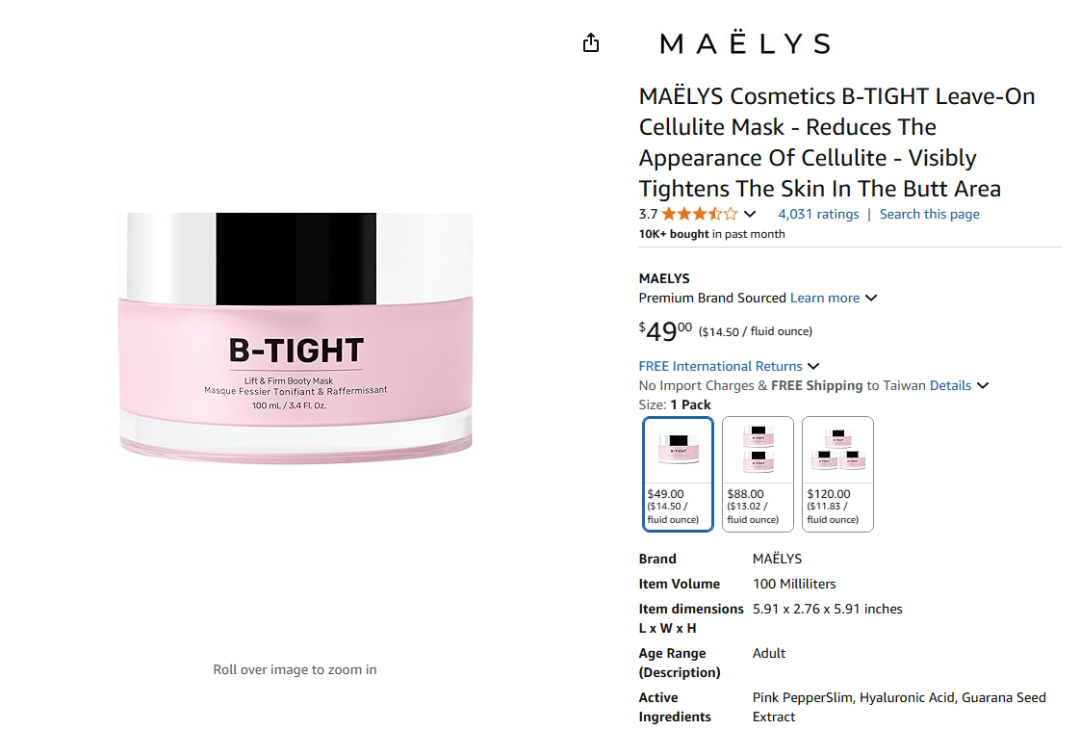 多元延伸:覆盖臀部提升面膜、大腿外弹力马克霜等细分品类,满足不同护理场景需求。