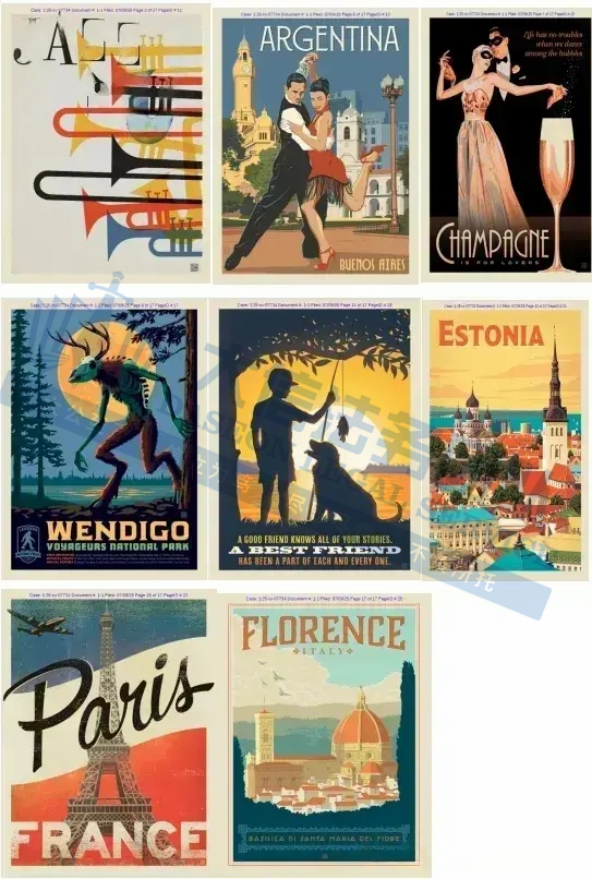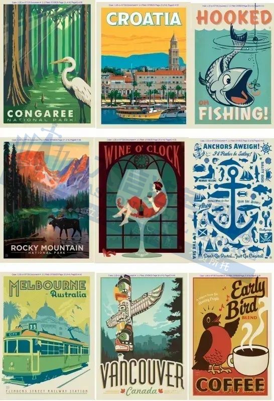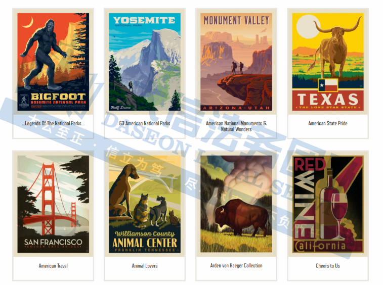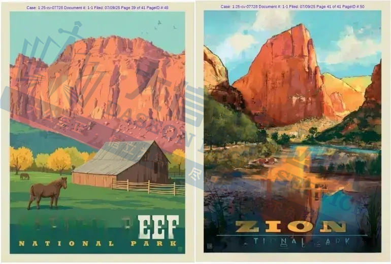 原告是美国的创意设计公司,成立于1993年,简称ADG,一家家族企业,专注于插画和海报设计,致力于传承20世纪艺术家和版画家的传统与技法。其创作过程独特,先手绘草图、绘画和文字,再用数字工具后期处理,所有印刷品等都在美国生产。其版权作品风格独特,将传统与现代巧妙结合,既有手绘质感,又融入数字工具后期处理,内容涵盖生活、地域景观、文学相关等多个主题,兼具艺术性与叙事性。