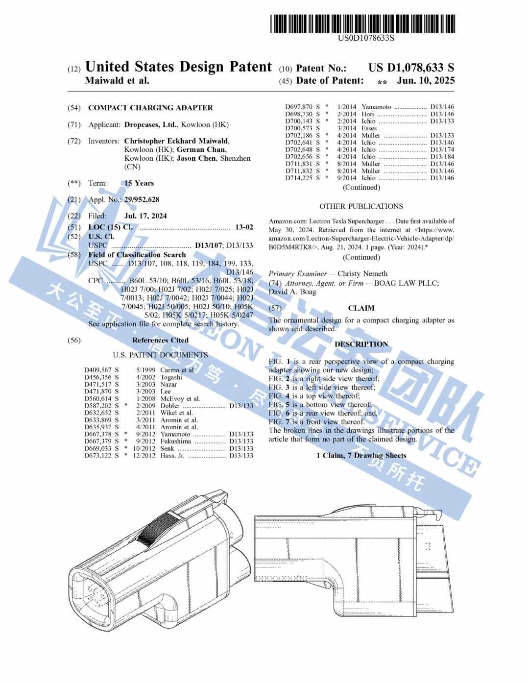 此案为专利维权,涉及一项美国外观专利,专利号:US D1,078,633 S,跨境卖家一定要注意检索下架,未经授权不得擅自使用,以下是涉案专利的具体信息,可供卖家参考,避免TRO侵权损失!