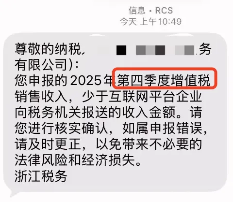 “尊敬的纳税人,您申报的2025年第四季度增值税销售收入,少于互联网平台企业向税务机关报送的收入金额。请您进行核实确认,如属申报错误,请及时更正,以免带来不必要的法律风险和经济损失。”