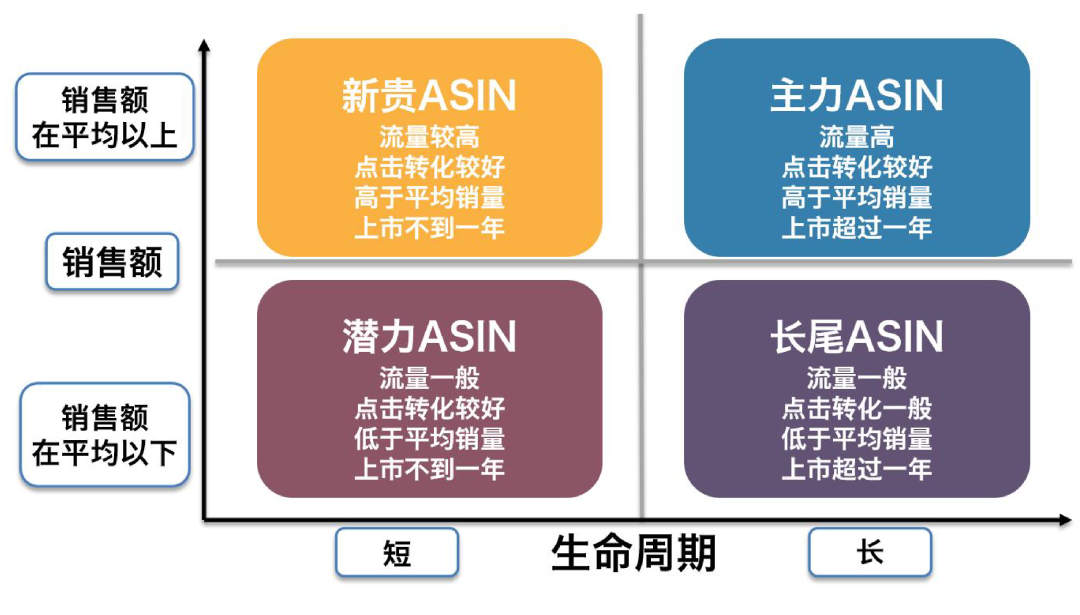 为实现“用一样的预算获得更多的销量”,广告君建议你先根据ASIN Matrix模型将自己某个品类中的ASIN按照生命周期(上市时间)和销售额分为四类(👇如下图),再开启今天的内容学习哦。