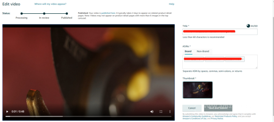 在“Title”填写产品简单的名称,“ASINs*”输入需要展示的ASIN,点击“Thumbnail *”上传视频封面图,一般尺寸在1280*720PX。