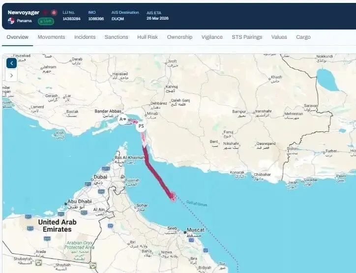 值得关注的是,该船在过境前曾出现长达 16 天的 AIS 信号中断,业内分析这一 “黑屏期” 或与该区域频发的卫星信号干扰有关。航行轨迹显示,该轮于 2 月 21 日驶离杰贝阿里港,3 月 2 日抵达伊朗阿巴斯港锚地抛锚。目前,Newvoyager 轮已驶入阿曼湾中部水域,AIS 信息显示其目的港为阿曼杜库姆港(Duqm)
