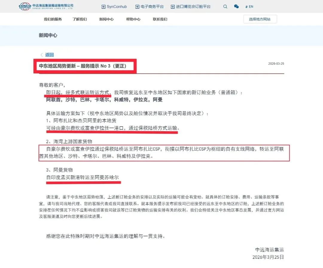 另一边,中远海运集运发布通知恢复中东六国订舱,随后又在 “更正” 中进一步明确:将以 “湾外靠泊 + 陆上转运”“绕行 + 多式联运” 等组合方案恢复中东服务。